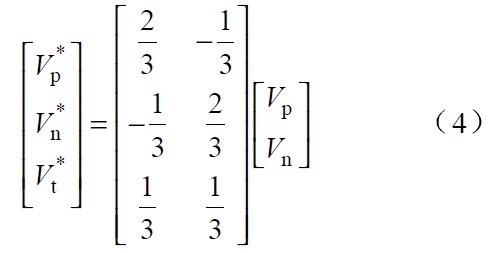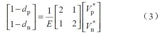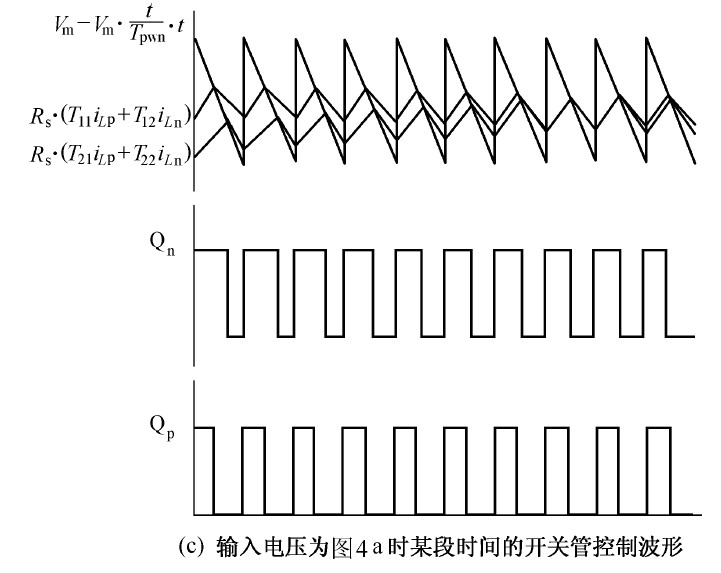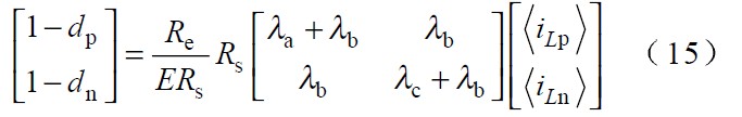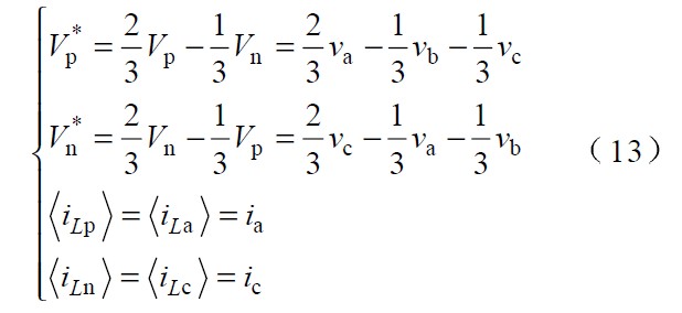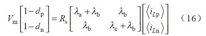 圖中 Vp 、Vn 為不同區間所對應的電壓,Lp、 Ln 和Lt 為不同區間所對應的電感,Tp、 Tn 為不同區間所對應的主控開關,dp 、dn 為主控開關的占空比。由于PWM 開關頻率遠高于電網頻率,因此,在一個開關周期內,各電感的電壓平均值為零,運用回路電流法和節點電壓法對各種開關狀態進行分,析可得出: