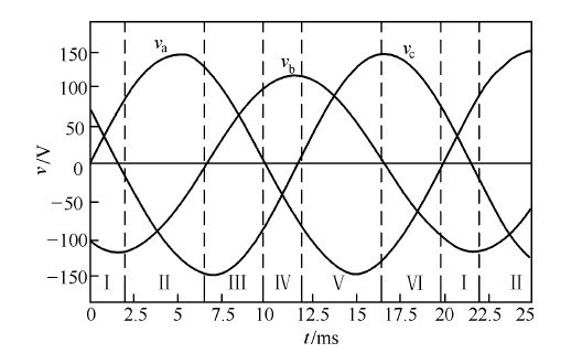 圖 1 給出了雙并聯升壓型三相整流器的主電路原理圖。另外,圖2 還給出了輸入電壓b 相幅值減少20% ,c 相相位滯后30 °時三相電壓的波形,并按虛線劃分為六個區間。須注意的是,輸入電壓不對稱的情況不同,其分區點也可能不同,分區點由各相非零序電壓瞬時最大幅度區分點所確定。依據六階段PWM 控制技術原理,三相整流器可以通過在線性周期的每一區間內控制兩個開關的通斷來實現單位功率因數。