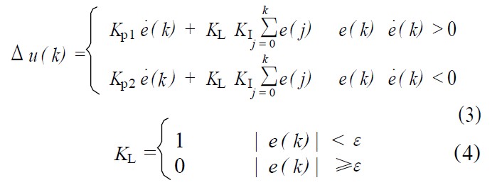 ③當(dāng)│e(k)│≤ε時,即偏差值e(k)進入穩(wěn)態(tài)區(qū)域時,加入積分環(huán)節(jié),可保證系統(tǒng)的控制精度。