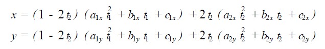 式中a1x , b1x , c1x , a1y , b1y , c1y為Si 段曲線的系數,由Pi , Pi + 1 , Pi + 2三點控制,參變量為t1 ,在公共段范圍內t1∈[0. 5, 1 ];式中a2x , b2x , c2x , a2y , b2y , c2y為Si + 1段曲線的系數,由Pi + 1 , Pi + 2 , Pi + 3三點控制,參變量為t2 ,在公共段范圍內t2 ∈[0, 0. 5 ]。