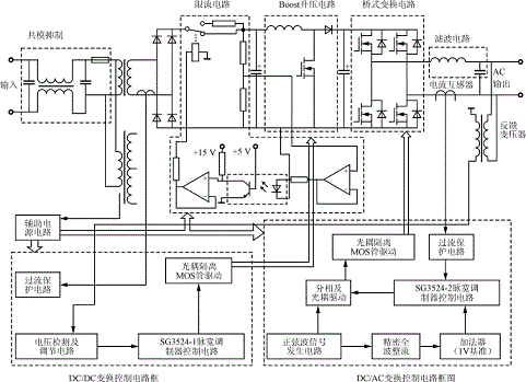 圖1示出了系統(tǒng)主電路和控制電路框圖。交流輸入電壓經(jīng)過共模抑制環(huán)節(jié)后,再經(jīng)工頻變壓器降壓,然后整流得到一個直流電壓,此電壓經(jīng)過Boost電路進行升壓,在直流環(huán)上得到一個符合要求的直流電壓350V(50Hz/220V交流輸出時)。DC/AC變換采用全橋變換電路。為保證系統(tǒng)可靠運行,防止主電路對控制電路的干擾,采用主、控電路完全隔離的方法,即驅(qū)動信號用光耦隔離,反饋信號用變壓器隔離,輔助電源用變壓器隔離。過流保護電路采用電流互感器作為電流檢測元件,其具有足夠快的響應(yīng)速度,能夠在MOS管允許的過流時間內(nèi)將其關(guān)斷。