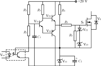 設(shè)計的驅(qū)動電路如圖5所示,它由驅(qū)動脈沖放大和5V基準(zhǔn)兩部分組成。脈沖放大包括光耦Vo1,R1和R2,中間級的VT1,推挽輸出電路VT2和VT3,對高頻干擾信號進行濾波的C1;5V基準(zhǔn)部分包括R4,VZ1和C2,它既為MOS管提供-5V的偏置電壓,又為輸入光耦提供副邊電源。其工作原理是: