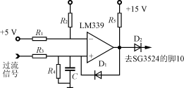 過流保護是利用SG3524的腳10加高電平封鎖脈沖輸出的功能。當(dāng)腳10為高電平時,SG3524的腳11及腳14上輸出的脈寬調(diào)制脈沖就會立即消失而成為零。過流信號取自電流互感器(對SG3524-1芯片串接在工頻變壓器的副邊,對SG3524-2芯片串接在濾波電路前),經(jīng)整流后得到電流信號加至如圖6所示過流保護電路上。過流信號加至電壓比較器LM339的同相端。當(dāng)過流信號使同相端電平比反相端參考電平高時,比較器將輸出高電平,則二極管D2將從原來的反向偏置狀態(tài)轉(zhuǎn)變?yōu)檎驅(qū)ǎ淹喽穗娢惶嵘秊楦唠娖剑@一變化將使得電壓比較器一直穩(wěn)定輸出高電平封鎖脈沖,則Boost電路停止工作,在正常狀態(tài)下,比較器輸出零電平,不影響B(tài)oost電路工作。