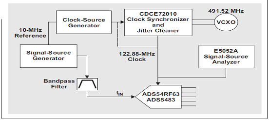 我們做了一個試驗,目的是檢查測得時鐘相位噪聲與提取自 ADC 測得 SNR 的時鐘抖動的匹配程度。如圖 11 所示,一個使用 Toyocom 491.52-MHz VCXO 的 TI CDCE72010 用于產生 122.88-MHz 采樣時鐘,同時我們利用 Agilent 的 E5052A 來對濾波相位噪聲輸出進行測量。利用一個 SNR 主要受限于采樣時鐘抖動的輸入頻率對兩種不同的 TI 數據轉換器(ADS54RF63 和 ADS5483)進行評估。快速傅里葉變換 (FFT) 的大小為 131000 點。