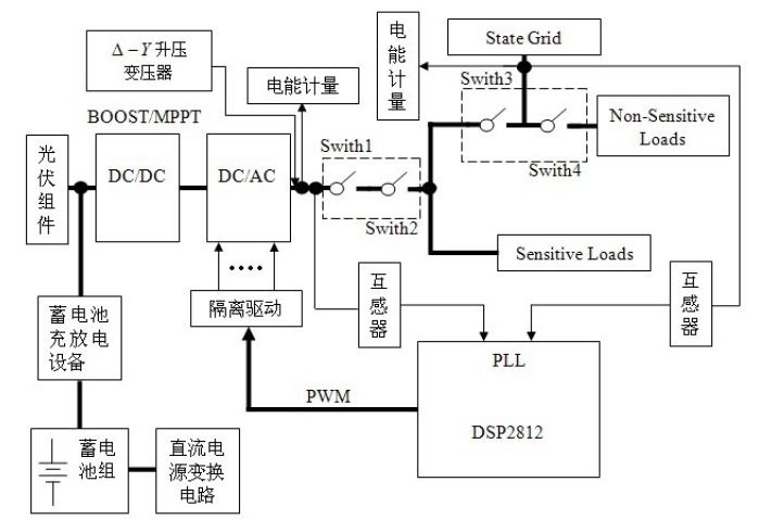 正常工作時(shí),開關(guān)Switch1、Switch2、Switch3、Switch4 同時(shí)閉合,為當(dāng)?shù)刎?fù)荷提供電能;當(dāng)電網(wǎng)缺相、電壓嚴(yán)重跌落等非正常狀況時(shí),由DSP 檢測(cè)出異常情況,做出判斷決策,并控制開關(guān)的開通與關(guān)斷。這時(shí),開通Switch1 和Switch2,關(guān)斷Switch3,保證重要負(fù)荷的供電。當(dāng)逆變器發(fā)生故障時(shí),立即斷開Switch1,逆變器退出,同時(shí)斷開Switch4,由電網(wǎng) 對(duì)重要負(fù)荷供電。當(dāng)逆變器故障消失時(shí),再與電網(wǎng)同步后,開通Switch1,在閉合Switch4。恢復(fù)對(duì)當(dāng)?shù)刎?fù)荷的供電。當(dāng)需要檢修逆變器時(shí),先斷開開 關(guān)Switch2,檢修完成后,重新閉合Switch2。