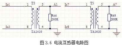 此系統(tǒng)輸出電流小于1A,故選擇最大可以測(cè)量1A 的電壓型電流互感器TA1410,負(fù)載電阻用是200歐,輸出電壓為-1~1V 的交流電壓。電路如圖3.6 所示。