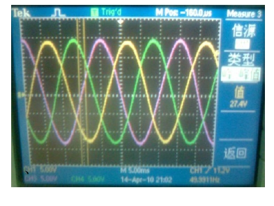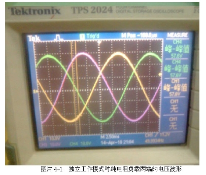 光伏并網(wǎng)發(fā)電系統(tǒng)要實(shí)現(xiàn)并網(wǎng),必須使逆變輸出與電網(wǎng)電壓的幅度、相位與頻率達(dá)到一致,否則將會(huì)使電網(wǎng)諧波增加、電能質(zhì)量下降,并產(chǎn)生并網(wǎng)環(huán)流,甚至造成光 伏發(fā)電系統(tǒng)的損壞。因此在并網(wǎng)過程中必須進(jìn)行同步鎖相控制、輸出電壓幅度控制以滿足并網(wǎng)的要求。根據(jù)IEEE Std 1547-2003 規(guī)定最大相位誤差為20 度,瞬時(shí)電壓誤差不能超過電網(wǎng)電壓的10%、最大頻率誤差不能超過0.3Hz。圖片4-1為獨(dú)立工作模式時(shí)純電阻負(fù)載兩端的電壓波形。
