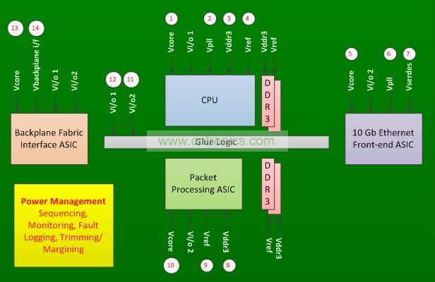 在圖1所示的線卡中,有四個主要的集成電路和一些粘合邏輯。每個集成電路都需要多個電源,并有定序的要求。這塊電路板有14個電源電壓,需要進行監測、定序、微調和裕度調整。此外,電路板的設計還需要將任何意想不到的電源故障記錄在非易失性存儲器中。
