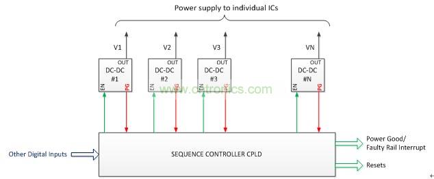 一個實現復雜的電源管理的常用方法(圖2)是使用DC-DC轉換器的電源良好信號,以監測這個電源,并使用CPLD來實現定序算法(控制DC-DC轉換器的使能信號)。CPLD也產生監測信號,如電源就緒/故障電壓中斷和復位信號。