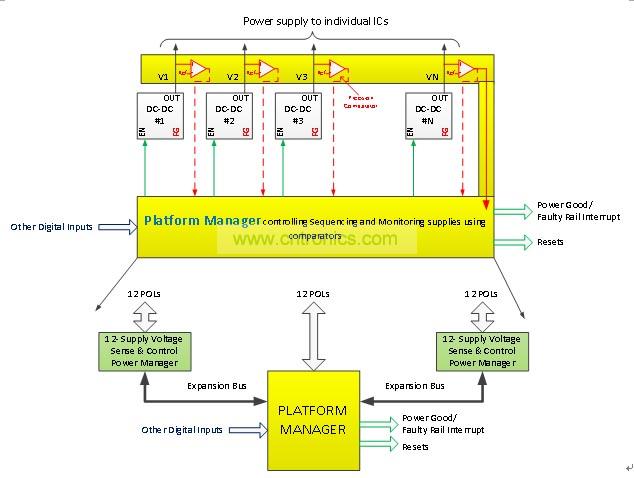 要求CPLD對電路板上超過12個電壓實現電源管理功能,如定序,復位產生等功能。這些設計取決于電路板上按裝的DC-DC轉換器產生的電源良好信號,用以監控這些電壓。然而,精度差的這些電源良好信號會導致電路板功能的可靠性大大降低。增加電路板的可靠性可以通過用精確的比較器替代這些電源良好信號,監控DC-DC轉換器的實際輸出電壓。