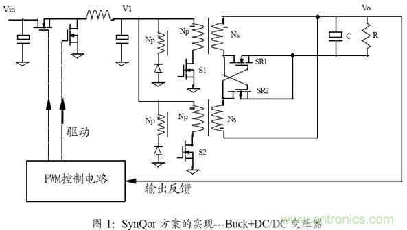 標(biāo)準(zhǔn)DC/DC 二次電源(半磚,1/4 磚)模塊,采用了Buck 與DC/DC 變壓器相級聯(lián)的兩級電路方案,如圖(1)所示。初初一看,這個(gè)方案比單級方案(如有源箝位正激電路)的元器件數(shù)要多,不太合理。但通過分析,可以發(fā)現(xiàn):其功率器件的總數(shù)并沒有增加(因?yàn)樵诘蛪捍箅娏鬏敵龅膽?yīng)用場合,輸出同步整流MOSFET 即使在單級方案中也要多個(gè)并聯(lián)才能實(shí)現(xiàn)效率指標(biāo));磁芯和電容元件的總面積也沒有增加(因?yàn)榭梢杂酶〉拇判竞碗娙荩5捎趦杉壏桨溉菀變?yōu)化和設(shè)計(jì),故模塊的電氣性能得到了極大的改善,具體分析見下面的介紹。