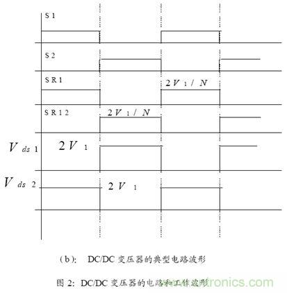 這個(gè)方案的第一級是一個(gè)同步整流Buck 變換器,它將不穩(wěn)定的輸入電壓,調(diào)整到后級DC/DC 變壓器所合適的輸入電壓,通過反饋輸出和誤差放大等,去控制Buck 變換器的PWM占空比,從而穩(wěn)定輸出。DC/DC 變壓器的電路和工作波形如圖2 所示: