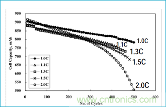 這是關于鋰離子電池充放電速率與其容量和循環壽命的關系圖,縱軸代表容量,橫軸代表循環壽命,由不同的點所描繪出來的曲線代表了用不同的速率對電池進行充放電時容量與循環壽命之間的關系。其中的C是與電池的容量有關的充放電速率數據,假設某個電池的容量為1000mAH,如果用1000mA的電流對它進行充電或放電,則充滿或放完其全部電能的時間是一個小時,這時候的C就代表1000mA,2C則代表2000mA。根據這些定義,這個圖告訴我們如下信息:這個電池的初始容量為900mAH,假如用1C即900mA的電流對它進行充放電,經過500個循環后,其容量還剩下大約780mAH;如果用2C即1800mA的電流對它進行充放電,則經過500個循環后,其容量會下降到大約500mAH。