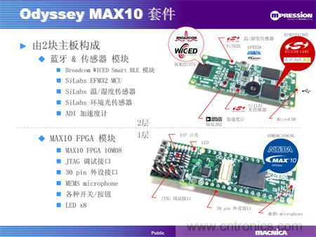 MAX 10 FPGA板卡以Altera的MAX10為核心,帶有30個(gè)插針的擴(kuò)展接口、紐扣電池接口、JTAG調(diào)試接口、各種開(kāi)關(guān)/按鈕和8個(gè)LED。藍(lán)牙及傳感器板集成了一個(gè)藍(lán)牙4.0模塊、一個(gè)32位處理器、溫度/濕度傳感器、紫外線/光敏/距離傳感器和加速度傳感器。