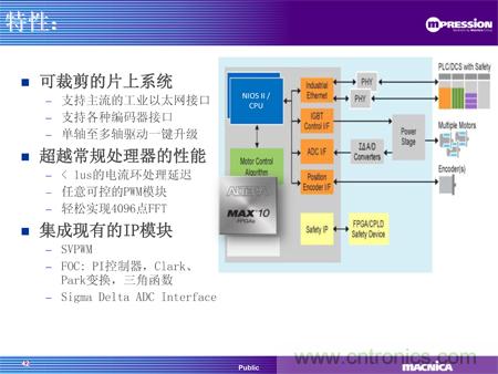 同期推出的還有駿龍科技基于MAX® 10 FPGA的電機(jī)驅(qū)動(dòng)方案,通過(guò)FPGA實(shí)現(xiàn)馬達(dá)控制的算法核心,提供了高性能、定制化和單芯片的解決方案,為馬達(dá)控制帶來(lái)革命性的質(zhì)的飛躍。使用FPGA 替代傳統(tǒng)的CPU/DSP架構(gòu)實(shí)現(xiàn)算法,意味著所有的算法都將通過(guò)硬件實(shí)現(xiàn),這樣由于處理能力限制而在CPU中無(wú)法實(shí)現(xiàn)的算法,現(xiàn)在都可以在MAX® 10 FPGA中以輕松地實(shí)現(xiàn)。Altera的MAX 10支持EtherCAT、Powerlink、Mechatrolink等工業(yè)以太網(wǎng)接口以及Endat 2.2, BISS等編碼器接口,用戶可以該方案中實(shí)現(xiàn)靈活可定制的接口。該方案還提供可定制的調(diào)試界面,客戶可以根據(jù)自己的需求,定制自己的調(diào)試界面,實(shí)時(shí)觀測(cè)內(nèi)部信號(hào)。