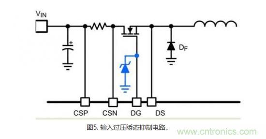 需牢記的一點是,雖然將MOSFET用于保護功能可實現對涌入或故障情況的快速響應,但是你應該在MOSFET的輸出端上執行一個適當的電壓緩沖,以確保用于保護功能的器件不會使下游電路出現問題。在升壓電路中,保護器件之后出現的第一個直插式組件是原邊電感器。續流二極管可以管理保護MOSFET與電感器之間的任何電壓振鈴,它只有在保護開關迅速關閉時才會導電,特別是在斷路器位于電感器左側時(圖5)。