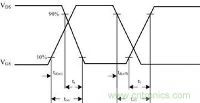 MOS管的損耗由開關(guān)損耗和驅(qū)動(dòng)損耗組成,如圖1所示:開通延遲時(shí)間td(on)、上升時(shí)間tr、關(guān)斷延遲時(shí)間td(off)、下降時(shí)間tf。