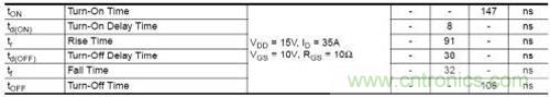 以FAIRCHILD公司的MOS為例,如表1所示:FDD8880開關(guān)時(shí)間特性表。