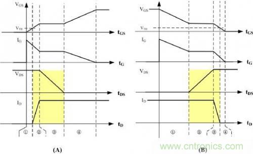 開關(guān)導(dǎo)通時(shí)對(duì)應(yīng)的波形圖如圖2(A),開關(guān)截止時(shí)對(duì)應(yīng)的波形圖如圖2(B),可以看到開關(guān)管每次導(dǎo)通、截止時(shí)開關(guān)管VDS電壓和流過開關(guān)管的電流ID存在交疊的時(shí)間(圖中黃色陰影位置),從而造成損耗P1,那么在開關(guān)頻率fs工作狀態(tài)下總損耗PS= P1 *fs,即開關(guān)頻率提高時(shí),開關(guān)導(dǎo)通與截止的次數(shù)越多,損耗也越大。