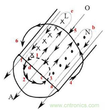 變壓器的鐵損主要由變壓器渦流損耗產(chǎn)生,如圖3所示,給線圈加載高頻電流時(shí),在導(dǎo)體內(nèi)和導(dǎo)體外產(chǎn)生了變化的磁場垂直于電流方向(圖中1→2→3和4→5→6)。根據(jù)電磁感應(yīng)定律,變化的磁場會(huì)在導(dǎo)體內(nèi)部產(chǎn)生感應(yīng)電動(dòng)勢,此電動(dòng)勢在導(dǎo)體內(nèi)整個(gè)長度方向(L面和N面)產(chǎn)生渦流(a→b→c→a和d→e→f→d),則主電流和渦流在導(dǎo)體表面加強(qiáng),電流趨于表面,那么,導(dǎo)線的有效交流截面積減少,導(dǎo)致導(dǎo)體交流電阻(渦流損耗系數(shù))增大,損耗加大。