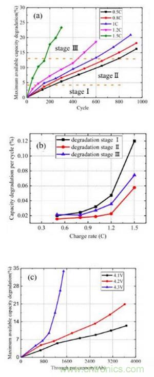 從數(shù)據(jù)可以看到,隨著充電的倍率的加大,鋰離子電池的衰降速率也在快速增加,并且從曲線的斜率來(lái)看,電池的衰降速度存在三個(gè)不同的階段,前期衰降速度較快的階段(階段1),中間衰降速度較慢的穩(wěn)定階段(階段2),和后期的衰降速率加速階段(階段3)。針對(duì)三個(gè)階段電池的衰降機(jī)理的研究認(rèn)為,階段1可能是因?yàn)殡姵豐EI膜生長(zhǎng)需要消耗一部分Li+,因此衰降速度較快。在階段2隨著SEI膜結(jié)構(gòu)的穩(wěn)定,內(nèi)部較為穩(wěn)定,因此衰降速度較慢,在階段3隨著電池老化,開(kāi)始發(fā)生活性物質(zhì)損失,電極活性界面減少,導(dǎo)致電池對(duì)于電流十分敏感。圖C是針對(duì)不同的截止電壓對(duì)電池衰降速度影響的實(shí)驗(yàn),從實(shí)驗(yàn)結(jié)果可以看到,當(dāng)把充電截止電壓提高到4.3V時(shí)會(huì)導(dǎo)致電池的循環(huán)性能急劇惡化,降低充電截止電壓可以有效的改善電池的循環(huán)性能。