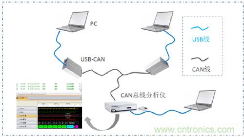 下面進入重點,如果兩個節點ID段相同會怎樣?我們用兩個CAN卡 和一臺CANScope開始實驗,CAN卡模擬CAN標準節點收發報文,CANScope做通信監控,如圖2所示。(注:CAN卡為USB轉CAN工具,CANScope為CAN總線分析儀,產品詳見ZLG致遠電子官網)