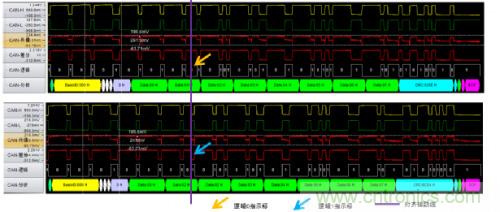 為什么會發生這種錯誤呢?發送報文的節點會在ACK段發送兩個隱性位,若在第一個位期間接收到顯性電平則認為該幀被正確接收。由于仲裁段相同時兩節點都認為自己取得仲裁權,在ACK段等待應答,但該網絡中僅存在兩個節點,因此在ACK段不能收到應答,進而發生應答定界符錯誤。簡單說來這種情形就類似于總線中只有一個節點將不能實現數據發送。圖7是在ACK段有無應答時的波形對比。