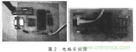 對(duì)應(yīng)于上述框圖的電路實(shí)物圖如圖2所示。其左右兩個(gè)電路分別對(duì)應(yīng)上述框圖中的左右兩個(gè)部分??傮w來說,它包括電平轉(zhuǎn)換電路、單片機(jī)處理部分、無線收發(fā)部分(CCll00收發(fā)器 )、液晶顯示模塊和鍵盤輸入模塊五個(gè)部分。