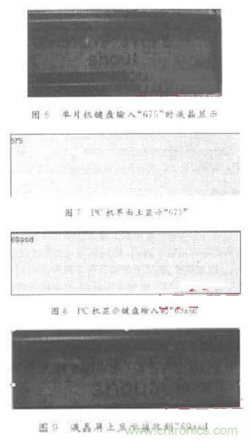 測(cè)試時(shí),連接好硬件打開串行口COM1,并設(shè)波特率為9600b/s.單片機(jī)發(fā)送字符串“675”給PC機(jī),其液晶顯示如圖6所示,相應(yīng)的PC機(jī)界面顯示如圖7所示。PC機(jī)發(fā)送“69asd”給單片機(jī),液晶屏上即可接收到“69asd”,如圖8,圖9所示。測(cè)試結(jié)果說明:基于串行口的PC機(jī)與單片機(jī)之間的雙工無線通信是切實(shí)可行的,而且無線傳輸?shù)木嚯x至少可達(dá)到100m.