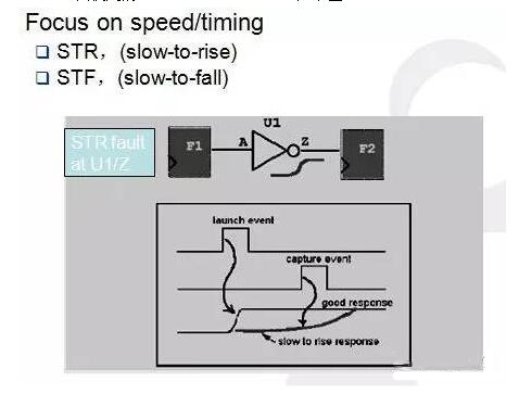 70年代到1995年這段時間里,由于芯片的工作頻率很低只有20-100M,scan測試只有DC SCAN,我們就能捕捉到所有std-logic的制造缺陷。但是1995年以后,測試科學家和工程師發現通過DC SCAN測試沒有缺陷的芯片在高工作頻率下使用會有問題。其根本原因是隨著制造工藝向深亞微米邁進,芯片的工作頻率也提高到200M-1G,原來的SCAN測試方法和模型不再能捕捉到所有的std-logic的制造缺陷。大家的一致想法就是-“奔跑吧,SCAN” ,把SCAN的頻率增加到與芯片的真實工作頻率一致,同時使用新的TransiTIon atpg model來產生測試pattern.