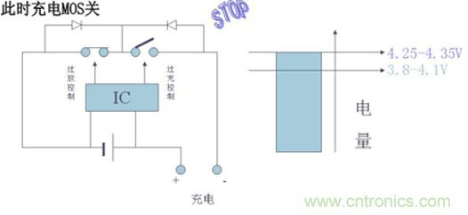 電池在被充電過程中,如果充電器電路失去控制,會使電池電壓超過4.2V后繼續恒流充電,此時電池電壓仍會繼續上升,當電池電壓被充電至超過4.3V時,電池的化學副反應將加劇,會導致電池損壞或出現安全問題。
