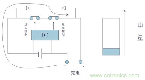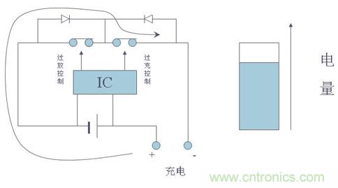 在帶有保護電路的電池中,當控制IC檢測到電池電壓達到4.28V(該值由控制IC決定,不同的IC有不同的值)時,其“CO”腳將由高電壓轉變為零電壓,使T1由導通轉為關斷,從而切斷了充電回路,使充電器無法再對電池進行充電,起到過充電保護作用。而此時由于T1自帶的體二極管VD1的存在,電池可以通過該二極管對外部負載進行放電。