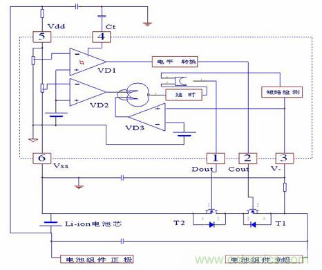 在保護板正常的情況下,Vdd為高電平,Vss,VM為低電平,DO、CO為高電平,當Vdd,Vss,VM任何一項參數變換時,DO或CO端的電平將發生變化。
