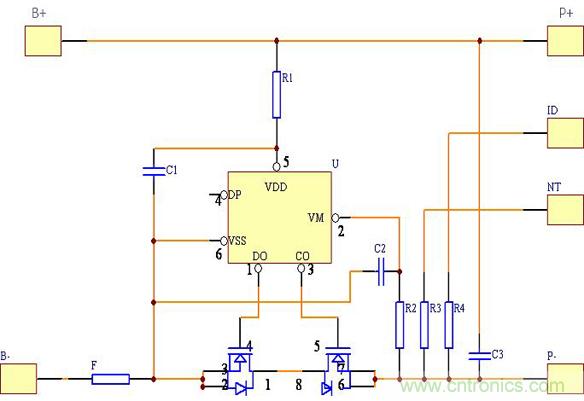 該保護回路由兩個MOSFET(T1、T2)和一個控制IC(N1)外加一些阻容元件構成。控制IC負責監測電池電壓與回路電流,并控制兩個MOSFET的柵極,MOSFET在電路中起開關作用,分別控