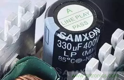 電源采用主動式PFC,因此使用容量為330μF的高壓濾波電容就能滿足需求。該電容的耐壓值為400V,耐溫值為85℃。