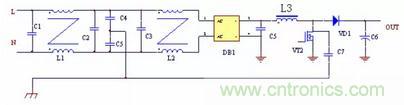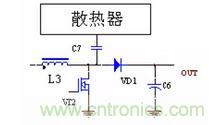 圖中C2 是二極管VD1 和VD2 與散熱器之間的耦合電容,容量一般在幾十PF,C3 是增加的電容,C3 要遠大于C2,DC/DC 整流管、續流管上的電壓峰值經過C2 與C3 的分壓,幅度大大降低,就可以大大減小向外的輻射。