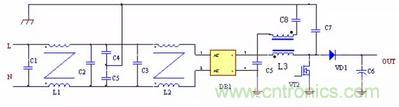 圖2 中,在PFC 升壓電感上增加一個輔助繞組,該繞組的匝數與主繞組相同,方向與主繞組相反,C7 是開關管與散熱器之間的耦合電容,如圖所示增加一個與C7 容量大致相同的一個電容接到散熱器與輔助繞組之間,這樣C7、C8 耦合到散熱器的騷擾信號幅度相同,方向相反,兩個信號剛好可以相互抵消,大大減小向外發射的騷擾電平。