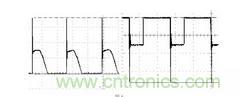 圖7 中,TI 是變壓器,VD1、VD2 分別是整流管和續流管,由于整流管、續流管在由導通轉向截止時有反向恢復電流,該反向恢復電流在VD1、VD2 兩端產生比較高的電壓峰值,由于快恢復二極管的反向恢復電流在幾十nS,所以峰值電壓的頻率較高,其基波頻率在幾十MHz,由于頻率很高,輻射能力很強,下圖8 是整流管和續流管的電壓波形。