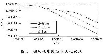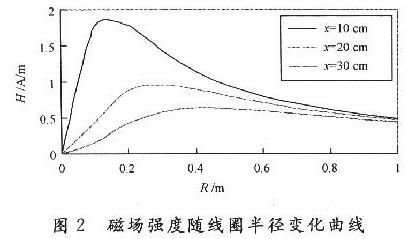 在與發(fā)射天線的距離x為常數(shù)并簡(jiǎn)單地假定發(fā)射天線線圈中電流I不變的情況下,如果改變發(fā)送天線的半徑R時(shí),就可以根據(jù)距離x與天線半徑R之間的關(guān)系得到最大的磁場(chǎng)強(qiáng)度H.這意味著:對(duì)于每種射頻識(shí)別系統(tǒng)的閱讀器作用距離都對(duì)應(yīng)有一個(gè)最佳的天線半徑R.如果選擇的天線半徑過(guò)大,那么在與發(fā)射天線的距離x=0處,磁場(chǎng)強(qiáng)度是很小的;相反,如果天線半徑的選擇太小,那么其磁場(chǎng)強(qiáng)度則以z的三次方的比例衰減,如圖2所示。