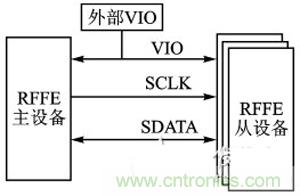 RFFE是MIPI聯盟針對射頻前端設備所提出的控制規范。單個總線上可以掛載1個主機,同時最多掛載15個從機。該總線使用2條信號線,一條是主機控制的時鐘線SCLK,另一條是雙向數據線SDATA,此外還有一條參考電壓線VIO。VIO可由主機提供,也可由外部提供。SCLK的標準頻率是32kHz-26MHz,擴展頻率是26MHz-52MHz,在空閑時SCLK和SDATA保持低電平。