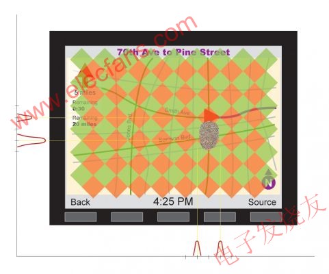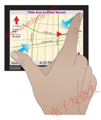 通過比較當前基于電阻式觸摸屏和帶手勢識別的電容式觸摸屏的汽車HMI概念,我們可以發(fā)現(xiàn),新增手勢識別功能后,駕駛?cè)藛T對路面的關(guān)注程度在某些方面有所改善。通過電容式觸摸屏的手勢識別不僅是一種新的輸入方式,更使系統(tǒng)輸入提升到了一個新的層次。采用電容式觸摸屏,駕駛?cè)藛T仍然可以通過點擊瀏覽菜單結(jié)構(gòu),滑動手指提高音量或者調(diào)節(jié)HVAC風扇速度。不過,真正重要的是其控制標準功能的簡易度,比如控制駕駛過程中非常必要的導航功能。用戶不必緊盯著屏幕,只需一個簡單的手勢即可實現(xiàn)縮小操作。屏幕上的任何區(qū)域都可以感知手勢,因此駕駛?cè)藛T不必把手指放在特定的位置來完成操作。圖1顯示就是這種導航屏幕上的動作感知說明。