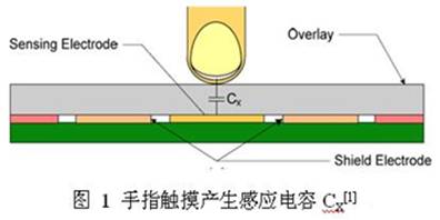 如圖1所示,對(duì)于電容式觸摸按鍵,手指的觸摸會(huì)改變感應(yīng)電容Cx,當(dāng)檢測(cè)電路對(duì)Cx充放電時(shí),Cx值的變化會(huì)引起電路信號(hào)變化,通過(guò)一定的檢測(cè)電路可以測(cè)量出該變化,從而判斷手指是否存在。不過(guò),系統(tǒng)整體功耗因?yàn)轭l繁的掃描Cx的大小而增加。