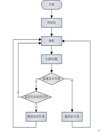 圖3是一個(gè)具有休眠功能的復(fù)雜系統(tǒng)軟件流程圖。此方法是將以上方法中的任務(wù)處理進(jìn)行分解,分為觸發(fā)新任務(wù),處理任務(wù)。目的就是減小在每個(gè)循環(huán)周期內(nèi)部執(zhí)行任務(wù)的所花費(fèi)的CPU資源。與上一個(gè)方法的不同在于:系統(tǒng)喚醒掃描按鍵程序,當(dāng)判斷按鍵有效時(shí),觸發(fā)新任務(wù),并不是將所有的任務(wù)處理完畢。在當(dāng)前的循環(huán)周期內(nèi),觸發(fā)的新任務(wù)可能沒(méi)有處理完畢,需要下一個(gè)或者更多個(gè)系統(tǒng)循環(huán)的時(shí)間才可以完成。當(dāng)判斷按鍵無(wú)效時(shí),不是馬上進(jìn)入休眠模式,而是判斷是否有沒(méi)有處理完畢的任務(wù)。如果有則繼續(xù)處理;如果沒(méi)有則進(jìn)入休眠模式。此方法可以處理比較復(fù)雜的任務(wù),能滿(mǎn)足更多應(yīng)用領(lǐng)域的需求。