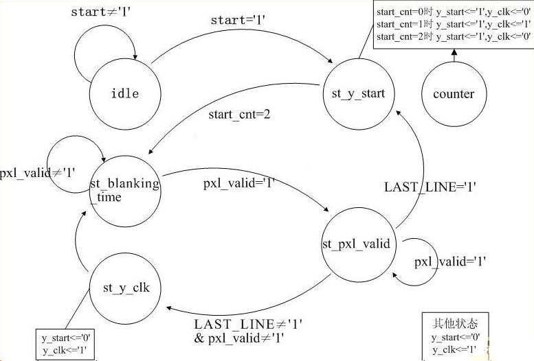 CMOS圖像傳感器結構簡單,內(nèi)部集成度高,因此僅需很少的外部控制信號即可完成視頻圖像的采集輸出。系統(tǒng)工作過程如下:當系統(tǒng)上電后,CPLD產(chǎn)生復位信號復位整個芯片到初始狀態(tài),然后對芯片進行并行數(shù)據(jù)注入,向CMOS圖像傳感器的特殊寄存器寫入預定值,設置諸如像元積分時間,像素讀出行數(shù),輸出放大器增益等參數(shù)。隨后CPLD給CMOS芯片提供 ss_start信號,標志開始像素積分,ss_stop信號結束像素積分,隨后圖像傳感器即處于可讀出狀態(tài)。向CMOS發(fā)出y_start信號開始一幀圖像的讀出,發(fā)出y_clock信號,開始一行圖像的讀出,當CMOS圖像傳感器有像素信號輸出時, pxl_valid引腳信號為高,此時CMOS圖像傳感器正在進行一行圖像的輸出,當pxl_valid變低時,一行圖像輸出結束,CPLD再提供下一個y_clock信號,啟動CMOS進行下一行圖像的讀出。當一幀圖像的最后一行開始讀出時,CMOS芯片的LAST_LINE引腳變高,標志一幀圖像讀出的結束,CPLD再產(chǎn)生下一個ss_start信號,開始下一幀圖像的讀出。這樣,CMOS就在CPLD的時序控制下,正常工作,循環(huán)讀出圖像。