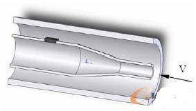 作者所在的研究組在前期應(yīng)用壓力梯度法和壓力互相關(guān)法測量液壓系統(tǒng)流量進行了理論和實驗研究,取得了一定進展,在此基礎(chǔ)上,提出這種不需要引壓,直接讓 MEMS敏感芯體在管內(nèi)獲得與流量對應(yīng)的差壓信號的新方法。相比之下新方法在對系統(tǒng)較低擾動的前提下更易獲得較高的信號水平,精度能滿足一般液壓系統(tǒng),具有高的動態(tài)測量頻寬。其機理是利用內(nèi)置于管道中特殊設(shè)計的異徑結(jié)構(gòu)裝置,如圖1所示,對內(nèi)外流體分別產(chǎn)生收縮和擴壓雙效作用,獲得低壓損、低能耗的微小壓力差,通過置于上面的MEMS敏感芯體測取,并根據(jù)建立的壓差-流量關(guān)系模型,及仿真手段和實驗測試得出該狀態(tài)下的流量值。