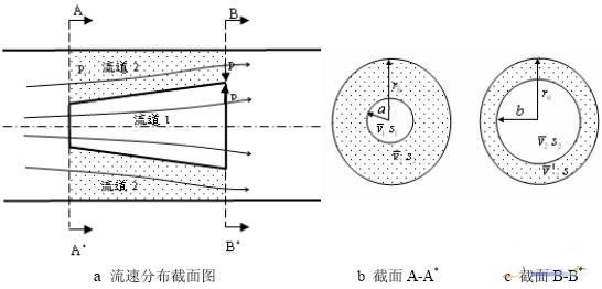 如圖2所示,流體在異徑管內(nèi)外被分為流道1和流道2,在這里,r0為管路半徑,a、b分別為內(nèi)流道入口和出口處半徑,忽略異徑管厚度,因此a、b也是外流道的進出口處內(nèi)徑,假設(shè)從截面A-A*到截面B-B*流線不發(fā)生增加或者減少,即任何A-A*面上一微元ds都可以沿著流線找到在B-B*面上的映射 ds*,則在流道1內(nèi)任一流線上有: