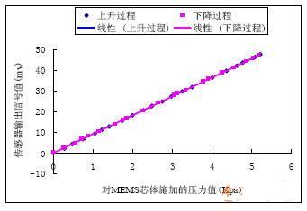 在進行實驗研究時,選取了一種壓阻式MEMS微型壓差敏感芯體,在組裝傳感器之前,采用了FLUKE 718 10G型壓力校準(zhǔn)儀(Pressure Calibrator)對芯體進行標(biāo)定。FLUKE 718 10G型壓力校準(zhǔn)儀通過其自帶的一個主氣泵和一個微調(diào)氣泵可以輸出穩(wěn)定的-12~30psi(-83~207KPa)氣壓,精度達到±0.05%滿量程。實驗所用的MEMS芯體額定工作壓力量程為6KPa(安全工作壓力十倍于滿量程),在10.00+/-0.01V激勵電壓下,用FLUKE壓力校準(zhǔn)儀標(biāo)定結(jié)果如下: