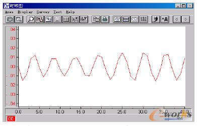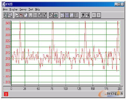 在動態(tài)試驗中,保持液壓泵提供20L/min的工作流量,使用Wavebook512信號系統(tǒng)對MEMS傳感器輸出流量信號進行采集,如圖7所示。盡管受到系統(tǒng)內(nèi)閥口、管路等造成的干擾,而且由于柱塞泵各柱塞在制造、安裝以及使用中產(chǎn)生的誤差和磨損造成的不均勻現(xiàn)象,導(dǎo)致流量波動曲線有些變形,但是還是可以很清晰的看出流量的波動周期約為60ms,即頻率16.7Hz。由于電動機工作在50Hz頻率,額定轉(zhuǎn)速1000r/min,因此相應(yīng)的軸向柱塞泵運轉(zhuǎn)頻率也是1000/60=16.7Hz,這正與上面的測量結(jié)果吻合。