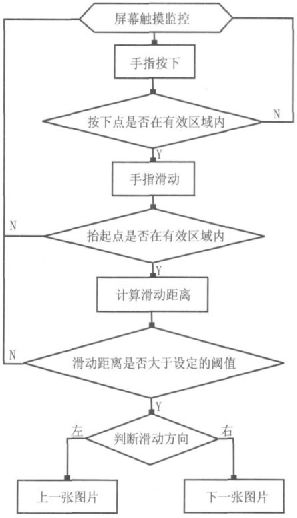 當(dāng)手指按下時(shí),首先判斷按下點(diǎn)的坐標(biāo)是否在設(shè)定的有效區(qū)域內(nèi),再判斷抬起點(diǎn)的坐標(biāo)是否在設(shè)定的有效區(qū)域內(nèi)。當(dāng)手指按下點(diǎn)和抬起點(diǎn)都在有效范圍內(nèi)時(shí),計(jì)算滑動(dòng)距離,若滑動(dòng)距離小于設(shè)定閾值,當(dāng)作是無效觸摸,不做任何處理。滑動(dòng)距離大于設(shè)定的閾值且向左滑動(dòng),切換為上一張圖片;滑動(dòng)距離大于設(shè)定的閾值且向右滑動(dòng),切換為下一張圖片。