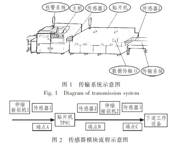 如傳感器流程示意圖1、圖2所示,假設(shè)一塊PCB的編號為01,首先從通過傳輸設(shè)備伸縮接駁機(jī)(編號為CS01)進(jìn)入設(shè)備貼片機(jī)(編號為TP01)進(jìn)行操作貼片流程,完畢之后再從貼片機(jī)(編號為TP01)進(jìn)入傳輸設(shè)備接駁機(jī)(編號為CS02),再通過傳輸設(shè)備接駁機(jī)(編號為CS02)進(jìn)入下一個SMT生產(chǎn)設(shè)備,如此反復(fù)。